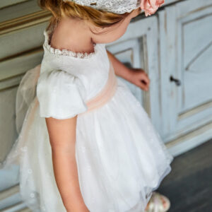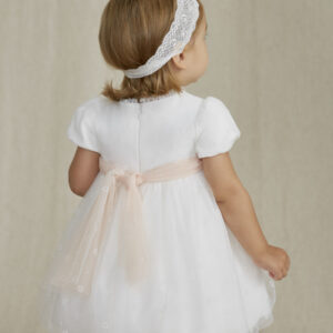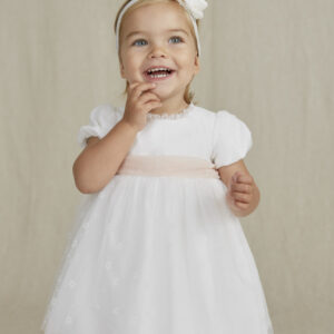 Beautiful flocked flowers tulle dress for baby. Pretty contrasting sash. Invisible fastening zip at the back. Matching nappy cover with the dress.