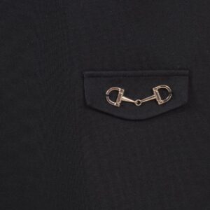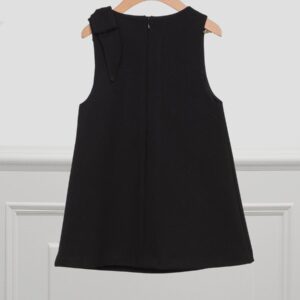 Simple and precious milano knit pinafore with V-neck and bow on the shoulder. Metallic details on the front. Invisible zip fastening at the back. Ideal for any occasion.