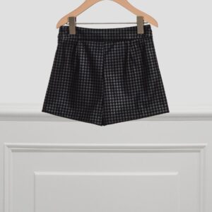 Elegant bermuda shorts with houndstooth. Velvety details. Inner waistband with elastic button fastening for a better fit and outer waistband with button. Invisible zip fastening on the side. Design with pockets. Beautiful velvet belt. Ideal to combine with any garment from our Autumn/Winter collection.
