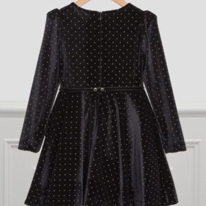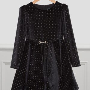 Beautiful velvet dress with studs. It has lining and cancan tulle to give more volume to the skirt. Long sleeves with pleated shoulders to give a more sophisticated touch to the garment. Velvet ribbon at the waist. Ideal for special occasions.