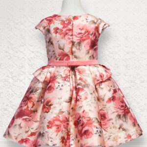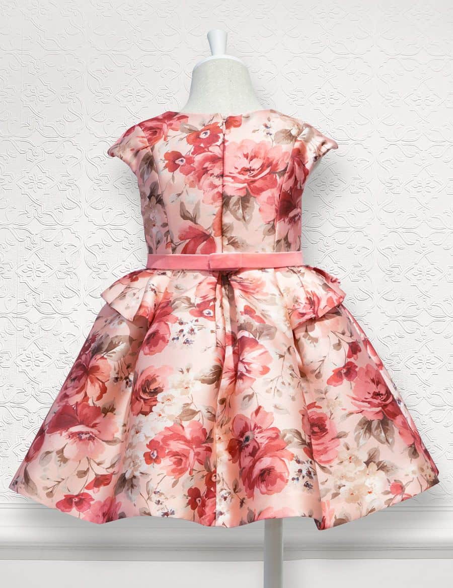 Delicate and cheerful dress made in mikado with lining and cancan tulle to give more body to the skirt. False velvet belt. Cut on the waist and pleated skirt. Invisible zip closure on the back.