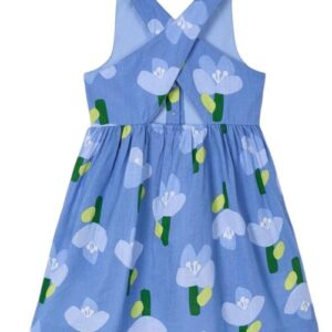 Sleeveless summer dress with cross over and cut out detailing at the back which is elasticated for a better fit. The dress fastens down the front with faux wooden buttons and has 2 front pockets finished with appliquéd bows.