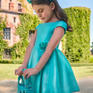 Delicate and exquisite dress made in Mikado with lining and cancan tulle to give body to the skirt. Bardot style neckline with straps. Flower appliqué at the waist. Invisible back zip. Ideal for any event.