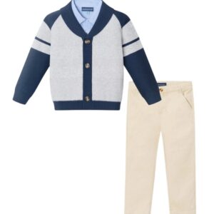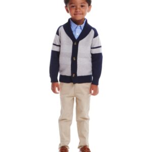 Elevate your child’s wardrobe with this Kids Navy/Heather Grey Shawl Cardigan & Pant Set. This versatile 3-piece set includes a stylish shawl cardigan in navy and heather grey, a classic chambray button-down shirt, and comfortable khaki pants, perfect for any occasion.