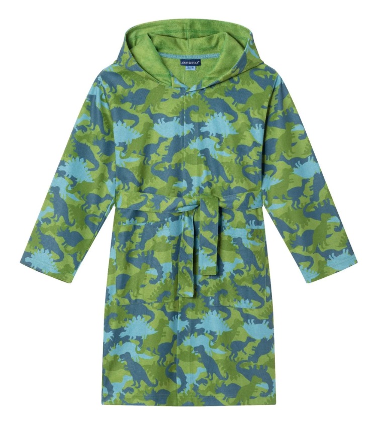 Embrace adventure with the Kids Olive & Teal Dino Camo Jersey Knit Robe. This cool robe features a fun dinosaur camouflage print, perfect for bedtime or just hanging out.