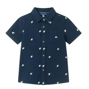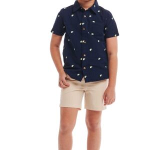 Elevate your little one’s sunny-day wardrobe with this dashing two-piece set. Featuring a navy printed button-up shirt and classic khaki shorts, it’s perfect for stylish adventures.