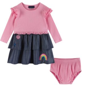 Dress your little one in playful charm with this delightful two-piece Infant Rib Knit Top & Tiered Skirt Set, featuring a pink ribbed top with ruffle details and a tiered denim skirt adorned with fun patches. Complete with matching bloomers, this set combines comfort and style, perfect for any adventure.