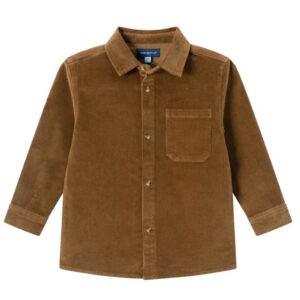 Introducing the Kids Garment Washed Brown Cord Buttondown. This classic buttondown shirt features soft corduroy fabric and timeless details, perfect for any casual or smart-casual occasion.