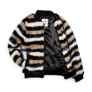 Appaman Kids’ Size Chart With its super soft faux-fur exterior and silky-smooth interior, the Appaman Kids Nikki Bomber Jacket is sure to be any fashionista’s new favorite! A striped design and contrasting ribbed trim lend a polished finish. A ribbed baseball collar and long sleeves add to the classic bomber silhouette. Full-zip front closure and slash hand pockets keep her warm and cozy. Shell: 100% polyester; Trim: 90% acrylic, 7% polyester, 3% spandex; Lining: 100% polyester. Dry clean only. Imported. Please note that measurements may vary by size.