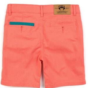 Great style is all in the details. These soft, lightweight chino shorts are a twist on a classic. Note the mini coin pocket with contrast button tab, rear pockets with faux button hole stitch details and contrast trim, and a double stitched hem for a finished look.