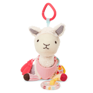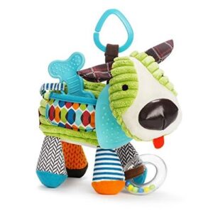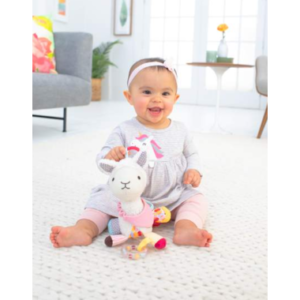 Perfect for multi-sensory play, this soft toy and teether in one features rattles, crinkle sounds and more for baby to explore. A soft bandana teether toy detaches for mom or dad to wear around the wrist for quick access.