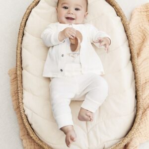 Made to match, this super soft set is complete with a button-front cardigan, a short-sleeve bodysuit and a pair of easy on pants.