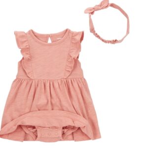 She’s super adorable in this ready-to-go outfit, complete with a bodysuit dress and matching headwrap.