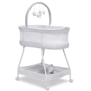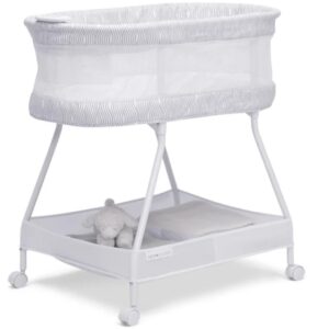 The Wave Bassinet by Delta Children is designed to help your little one fall asleep faster and stay asleep. This must-have bassinet features a control panel at the front with vibration, nightlight and soothing sounds to lull your newborn to sleep while mesh sides provide open airflow for breathability and a clear view of your baby. For your convenience, the adjustable toy bar provides entertainment if your baby wakes, lockable wheels make it easy to move around the house, and the easy-to-reach storage basket keeps changing essentials within reach. The Wave Bassinet by Delta Children is the easiest way stay safely connected and close to your baby during their first few months, and the modern wave print on the trim looks great in your master bedroom while room sharing or in your baby’s nursery. This bassinet is recommended for babies 0-5 months or up to 30lbs. Stop use at 5 months or once your infant begins to push up on their hands and knees, whichever comes first.