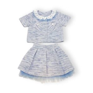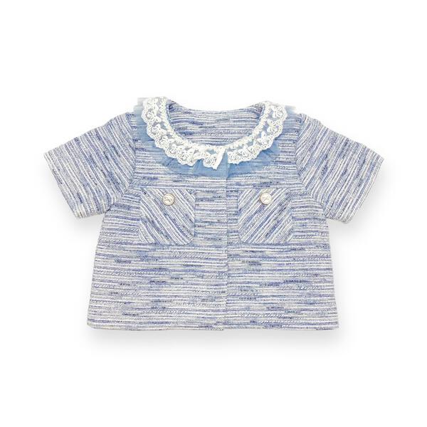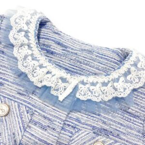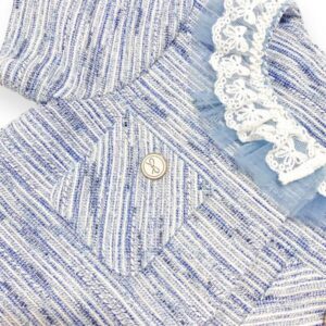 Blue tweed jacket with embellished front pockets with bow buttons and elegant lace trim. Also available in pink! Matching tweed skirt available separately.