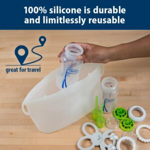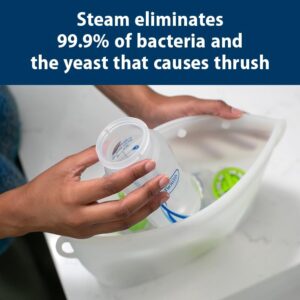 The sterilizer bag you can use over and over again. Dr. Brown’s 100% silicone Microwave Sterilizer Bag uses steam heat to quickly and effectively sterilize baby bottles, bottle parts, breast pump parts, pacifiers, teethers, and more. The large capacity bag holds up to three 8 oz (250 mL) Narrow Dr. Brown’s Bottles along with parts and accessories. To sterilize, pour 2 oz of water into the bag, add items, and microwave for 3 minutes. Sterilization eliminates 99.9% of bacteria and the yeast that causes thrush. Side-grip hooks allow you to handle the bag safely, and the flat base keeps the bag in a stable upright position. This reusable silicone bag is durable and a long-lasting alternative to disposable plastic sterilizing bags. It can also be used to store baby, household, or travel items when not being used as a sterilizer. Flexible for easy storage and on-the-go use. Dishwasher safe and BPA-free.