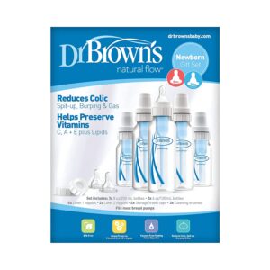 The Dr. Brown’s natural flow standard baby bottles offer a wonderful feeding experience with innovative vent technology. Dr Brown’s bottles use a patented 2-piece internal vent system for your baby’s comfort. This system creates positive-pressure flow for vacuum-free feeding that is similar to breastfeeding. The breast milk or formula flows freely without nipple collapse. As the baby feeds, air is channeled from the nipple collar through the vent system to the back of the bottle. Air never mixes with the breast milk or formula so oxidation is prevented, thereby maintaining essential vitamins such as C, A and E. The vent system eliminates air bubbles in the formula or milk, which helps to reduce feeding problems like colic, spit-up, burping and gas. Dr. Brown’s bottles are completely BPA, PVC, lead and phthalate free for your baby’s safety. The Newborn Feeding Set comes with three 8 ounces/240ml standard bottles, two 4 ounce/120 ml standard bottle, 2 extra Level-Two silicone nipples, 2 Storage/Travel caps and 3 “cleaning” brushes are small nipple brushes and they are inside the bottles. Avoid formula bubbles: Do not shake the bottle. Formula should be stirred qently to fully dissolve lumps – they can clog nipple holes.