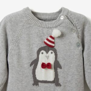 Created by Elegant Baby- known for their luxurious knitted gift giving pieces- this unisex romper will leave your little one comfy and cozy all throughout the season. Heather grey body in a long sleeve and footless design, with ribbed stretchy banding on the neckline, arm holes and feet holes. Intarsia knit Penguin on the chest, featuring a burgundy and white 3D knit hat and bowtie. Triple button angled opening on the right side of the neckline and chest. Hidden snap button closure down the legs. Solid back. Made out of midweight 100% cotton. Includes a padded cotton hanger!