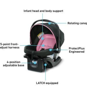 The car seat is Graco ProtectPlus Engineered to help protect in frontal, side, rear, and rollover crashes.