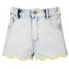 Fun basic!! Daisy embellishments adorn these vintage washed denim shorts with fray hemline.