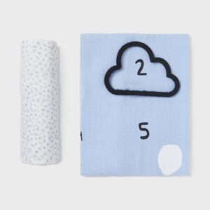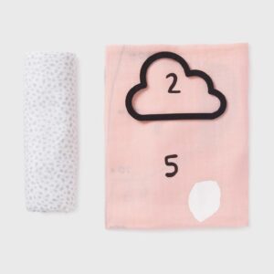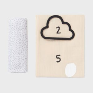 Gauze with measuring accessory to photograph your baby’s growth during their first year. Just place your baby in the centre of the gauze, mark their months of life with the indicator and measure their height.