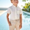 Short sleeved Shirt for boy. Mandarin collar in same colour. Fresh and contemporary fabric with linen. Functional front pocket.