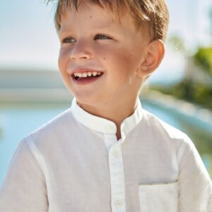 Short sleeved Shirt for boy. Mandarin collar in same colour. Fresh and contemporary fabric with linen. Functional front pocket.