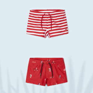 Set of two swim trunks for boy in complementary colour schemes, with a comfortable and refreshing design for the days spent at the beach.
