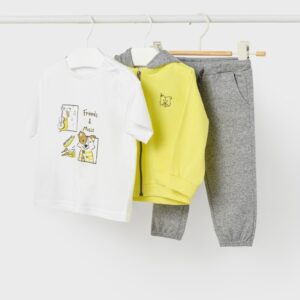 Three piece tracksuit for baby made up of a hoodie, jogging bottoms and a matching t-shirt.