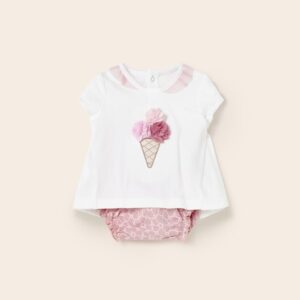ECOFRIENDS garment, contains sustainable cotton. Four piece set for newborn composed of two combinable sets. Both sets include a short sleeved t-shirt and a pair of shorts.