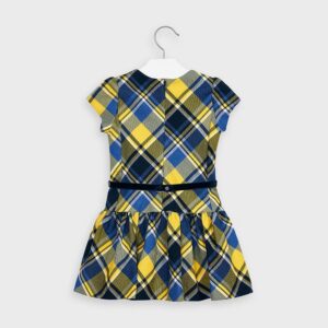 Short sleeved dress for girl aged 2 to 9 years. Round neckline. Opening on the back with an invisible zip. Made from comfortable knitted fabric. Gathered design. Removable velvet belt. Checked pattern.