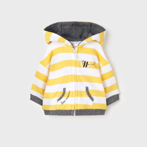 Long sleeved sweatshirt for newborn boy. Hooded collar. Front, central zip fastening.