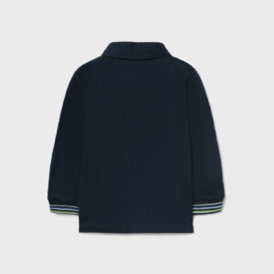 Long sleeved Polo shirt with contrasting coloured elasticated cuffs for Baby boy 12 to 36 months. Shirt collar. Button fastening on the collar for an easy fit. Made from 100% cotton fabric.