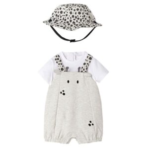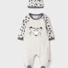 Grey romper and hat set for boys by Mayoral. Made from soft cotton jersey, the dungaree style romper is designed to look like a giraffes face. Fastens with a zip at the back and popper’s between the legs for easy changing. Comes with a matching reversible hat that fastens with velcro chin straps.Â
