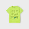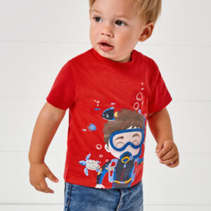 Short sleeved T-shirt for baby boy. Round neckline. Snap-button fastenings on the shoulder to allow the garment to be put on easily. Made from comfortable knitted fabric. Decorative elements: design on the front.
