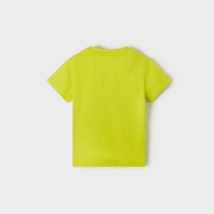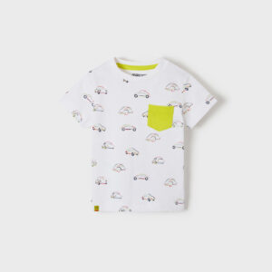 Short sleeved T-shirt for baby boy. Round neckline. Snap-button fastenings on the shoulder to allow the garment to be put on easily. Made from comfortable knitted fabric. Functional front pocket. Patterned design.