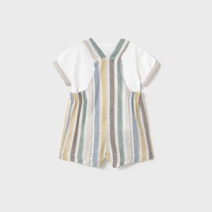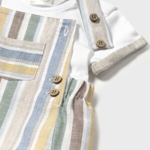 Two-piece suit consisting of a white t-shirt and dungarees in shades of beige, light blue and yellow. Scroll down the page to see the matching products. Newborn Line.