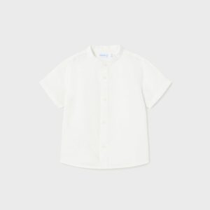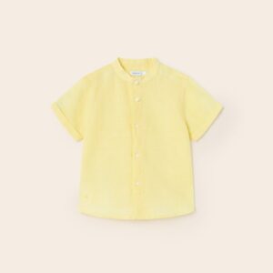 Short sleeved Shirt for baby. Grandad collar in same colour. Button fastenings down the front. Fresh and contemporary fabric with linen.