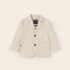 Long sleeved jacket for baby. Lapel collar. Button fastenings down the front. Fresh and contemporary fabric with linen. Functional front pockets.