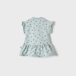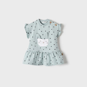 Mayoral polka dot jersey dress in green. Such a cute and playful dress for a little girl. The dress has a rabbit print pocket on the front of the dress.