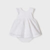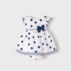 Ivory and beige striped dress for younger and baby girls by Mayoral. Made from soft cotton, it features beige and gold thread striped and it has detachable belt with embellished metallic flower and flower applique. It fasten with zip at the back. The silky under layers have a tulle frill attached to add extra volume.