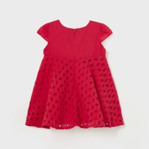 Short sleeved dress for baby. Opening on the back with an invisible zip. Made from 100% cotton fabric. Decorative elements: bow applique.