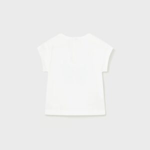 ECOFRIENDS garment 100% sustainable cotton. Short sleeved T-shirt for baby. Round neckline. Snap-button fastening on the back to allow the garment to be put on easily. Decorative elements: embroidery, fringing.