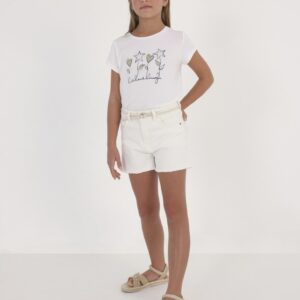 ECOFRIENDS garment, contains sustainable cotton. Shorts for girl. Single button fastening. Functional pockets on the front and back of the item.