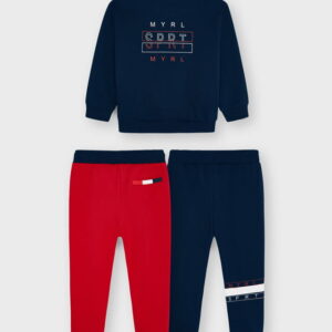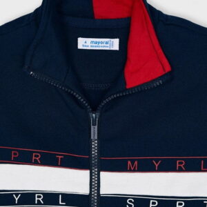 A great Mayoral tracksuit for a boy consisting of a navy blue sweatshirt with applications, fastened with a zipper and navy blue and red sweatpants with side pockets, drawstrings at the waist for adjustment.