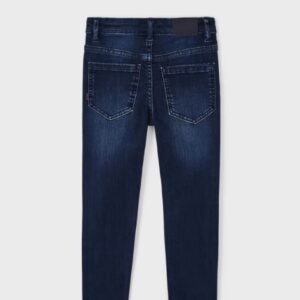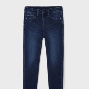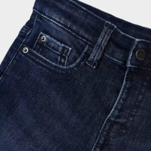 Slim fit trousers for boy which fit well to the figure. Snap-button fastening on the front. Adjustable elastic waistband with buttons inside the waistband for a better fit. Comfortable denim fabric, perfect for everyday outfits. Contains sustainable trimming. Washed effect obtained through Ecowash processes with lower environmental impact.