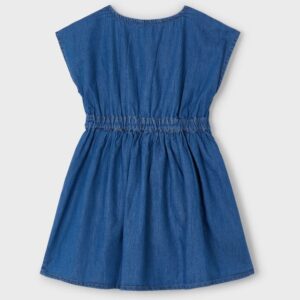 Contains TENCEL TM Lyocell fibres. Short sleeved dress for girl. Round neckline. Button fastenings down the front. Elasticated waistband. Puckered front. Decorative elements: Decorative knot..