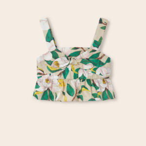 Top with braces for girl. Design with a decorative ruffle at the bottom of the item. Patterned design.