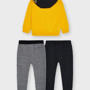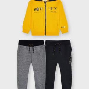 Three-piece tracksuit for boys 2 to 9 years old, consisting of a sweatshirt and two long sports trousers. Thick and warm fleece fabric, particularly suitable for protection against the cold.Long sleeved hoodie for boys 2 to 9 years old with elasticated cuffs. Hooded collar. Central front zip fastening. Elasticated bottom for better fit.Jogger-style trousers for boys 2 to 9 years old, loose-fitting at the top and narrower as they go down towards the ankle. Perfect for sporty looks, reflecting the sporty influence of streetwear. Elasticated waist with adjustable drawstring. Knees reinforced on the inside, specially designed to give greater resistance in the area of most wear and tear. Bottoms with elasticated waistband for a better fit.
