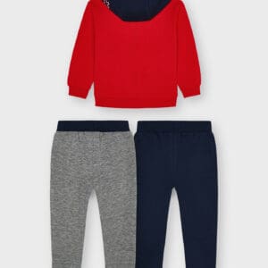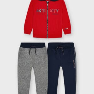 Three-piece tracksuit for boys 2 to 9 years old, consisting of a sweatshirt and two long sports trousers. Thick and warm fleece fabric, particularly suitable for protection against the cold.Long sleeved hoodie for boys 2 to 9 years old with elasticated cuffs. Hooded collar. Central front zip fastening. Elasticated bottom for better fit.Jogger-style trousers for boys 2 to 9 years old, loose-fitting at the top and narrower as they go down towards the ankle. Perfect for sporty looks, reflecting the sporty influence of streetwear. Elasticated waist with adjustable drawstring. Knees reinforced on the inside, specially designed to give greater resistance in the area of most wear and tear. Bottoms with elasticated waistband for a better fit.